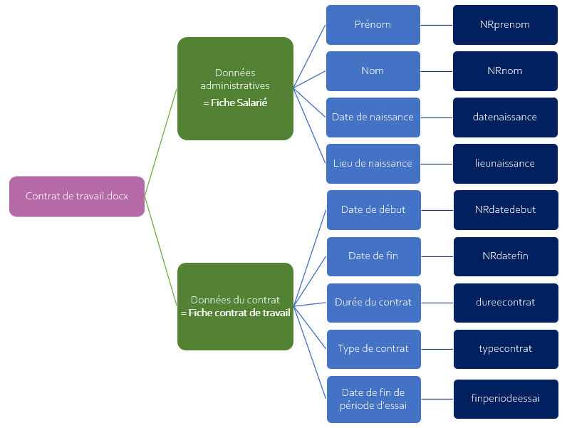 Si l'on prend l'exemple d'un contrat de travail, le document généré à partir de la fihce Contrat de travail, comprend des données issues de la fiche courante (les dates du contrat de travail) mais aussi de la fiche du salarié (nom, prénom, etc.).