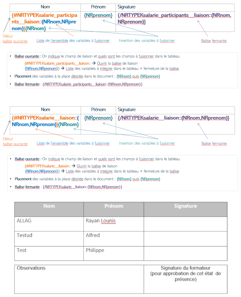 - Une première balise, dite balise ouvrante inclue une variable de liaison entre la fiche de la formation et la fiche salarié pour y récupérer les données d'identité du salarié, suivi de la liste des variables que l'on souhaite insérer dans la feuille d'émargement :