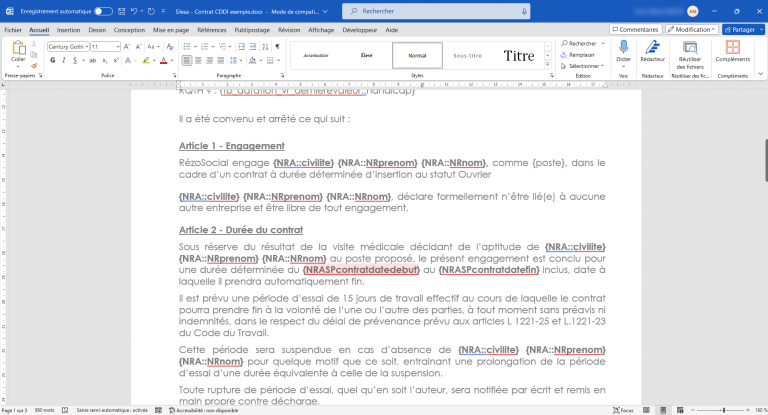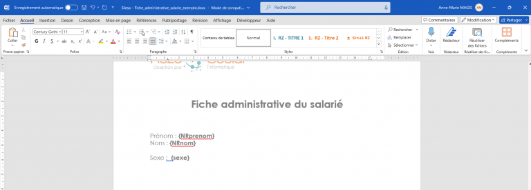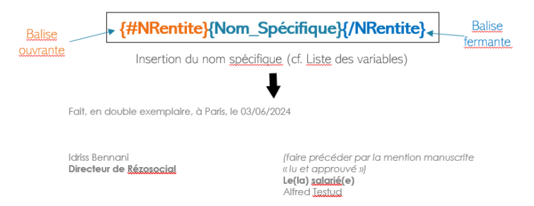 Lorsque l'on télécharge le fichier le logiciel remplace la balise par la donnée dans la fiche. Par exemple, si l’on paramètre le document qui servira de modèle de fusion pour une fiche administrative disponible dans la fiche du salarié on saisit les informations de la manière suivante par exemple :
