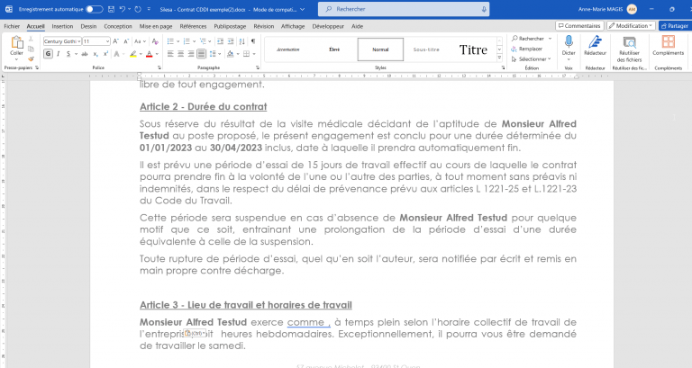 La procédure de conception d’un document comporte différentes étapes selon les données à fusionner. Les étapes ci-après décrites prendront exemple sur la base de la création d’un contrat de travail-type.