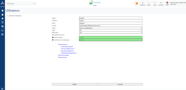 - Entité : rattachement de l'utilisateur aux entités sur lesquelles il est amené à travailler (cf. gestion des entités).
