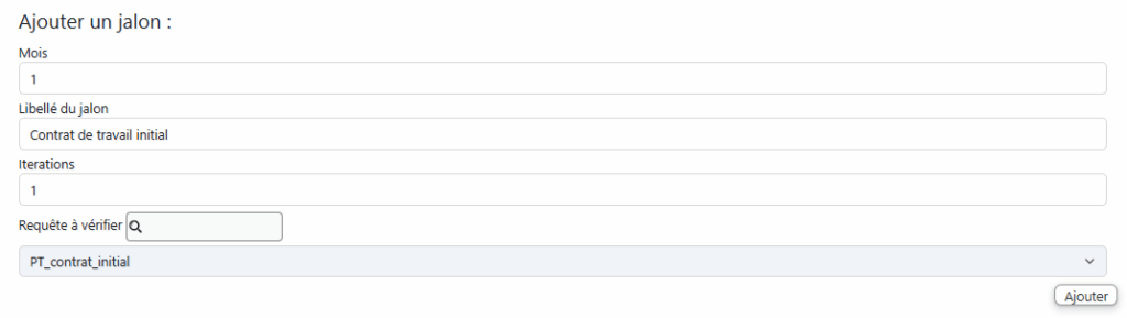 Pour chaque jalon à intégrer au parcours, il faut d’abord créer une requête. Cette requête doit permettre d’identifier les situations où la condition du jalon est remplie (par exemple : un entretien manquant, une formation non réalisée, etc.).