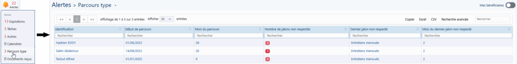 Si l’un de ces jalons n’est pas respecté dans les délais prévus, une alerte de type Parcours-type est automatiquement affichée parmi les alertes.