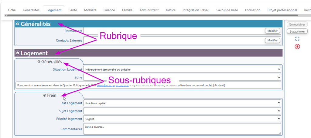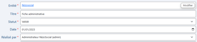 Les formulaires de saisie dans le logiciel sont tous composés de champs obligatoires, de rubriques et sous-rubriques et de différents types de champs.