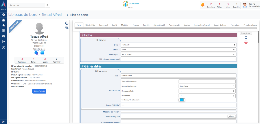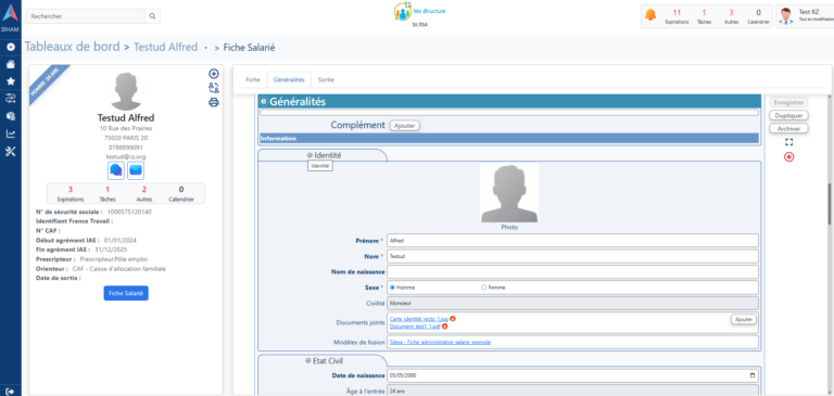 < Retour Accueil Navigation et saisie Le parcours d'un salarié dans une SIAE Le parcours d’un salarié dans une SIAE Au fil du parcours du salarié/bénéficiaire différents types de fiches sont saisissables dans le logiciel afin de pouvoir rendre compte de la situation à date. Début du parcoursArrivée du salariéCréation de la fiche du salarié+Création du 1er contratParcoursInsertionBilans & Entretiens+Contrats de travail+Formations & Évaluations+Diverses fiches de suivi des actions menéesFin du parcoursSortie de la SIAEBilan de sortie+Date et motif de sortie