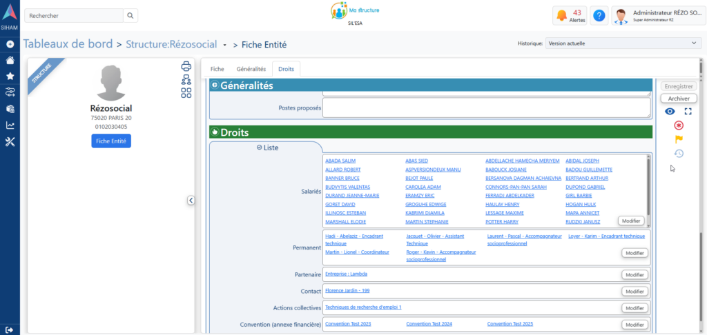 En plus de l’accès à l’interface d’administration du logiciel, l’administrateur dispose de droits supplémentaires auxquels les autres profils n’ont pas accès, notamment la gestion des entités.
