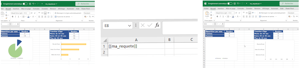 - Une fois les formules créées, supprimer les données et saisir dans la cellule A1 le nom de la requête entouré de double-crochets, tel que : [[Nom_requete]]