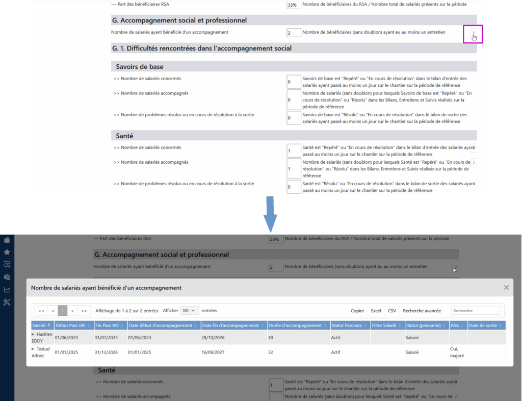 Pour les résultats non nuls et ne correspondant pas à des pourcentages, il est possible d'afficher le détail des salariés pris en compte.