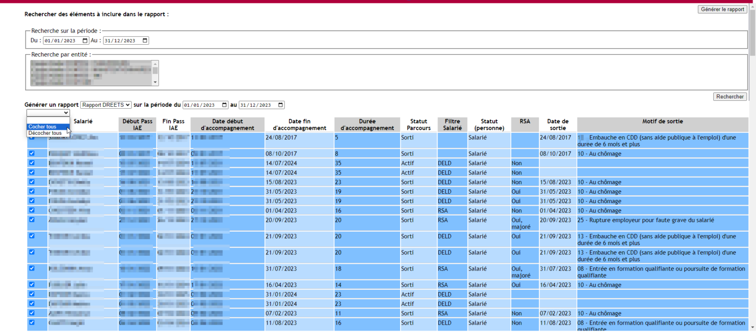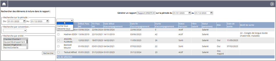 Cocher les salariés à inclure dans le rapport ou cocher l’ensemble des salariés en sélectionnant Cocher tous dans la liste déroulante